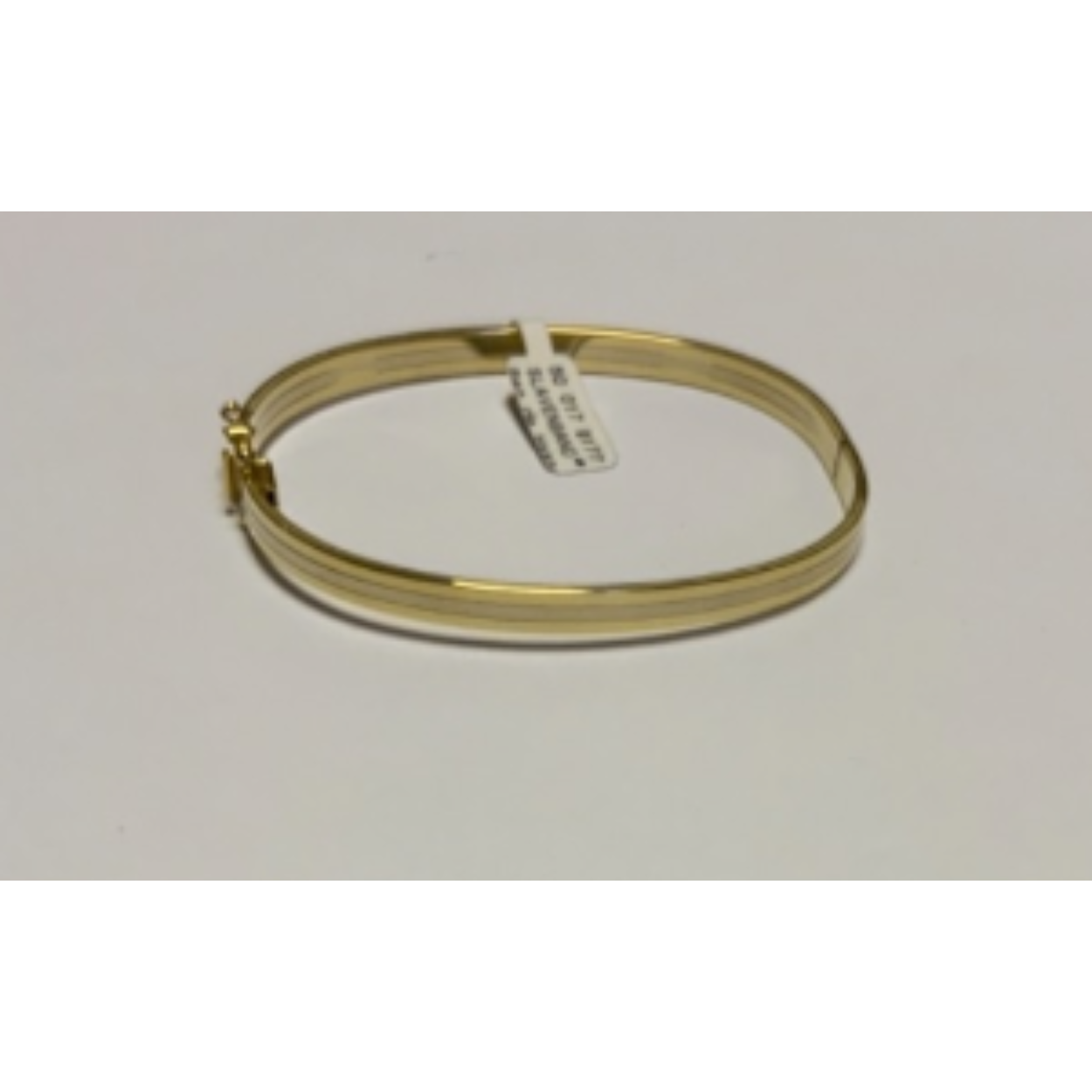 Bicolour gladde bangle armband. De buitenbanen zijn geel, de middenbaan is wit. Met scharnier, baksluiting en 2x vh8.