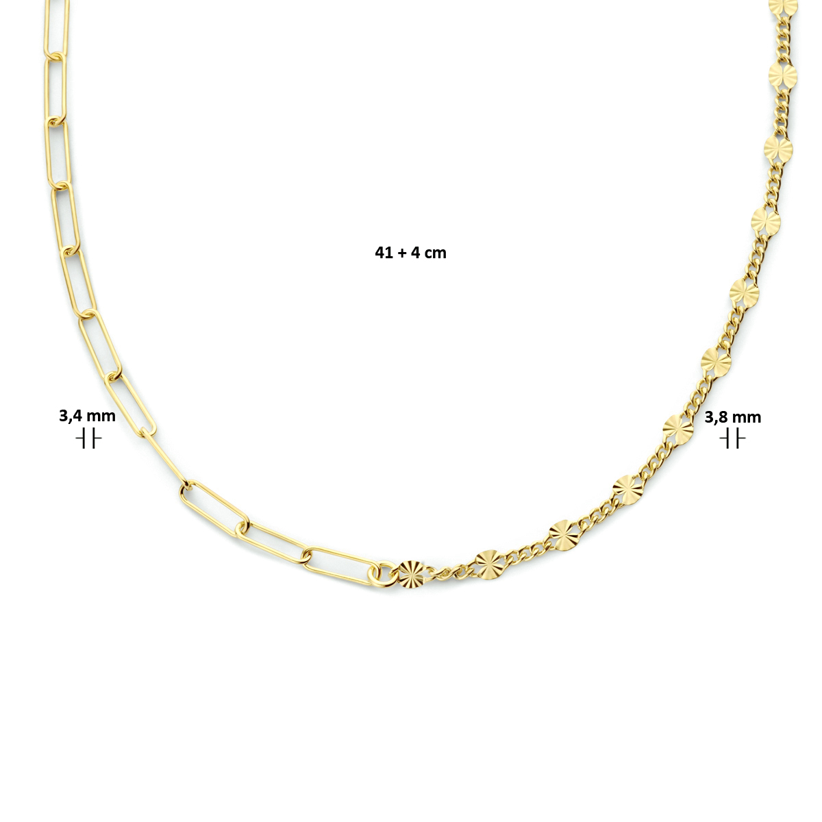 Geelgoud op 925 zilveren collier met een schakelbreedte van 3.8mm, uitgevoerd met een anker schakel en plaatjes. Het collier heeft een draaglengte van 41cm met een extensie van 4cm en een stevige karabijn sluiting.