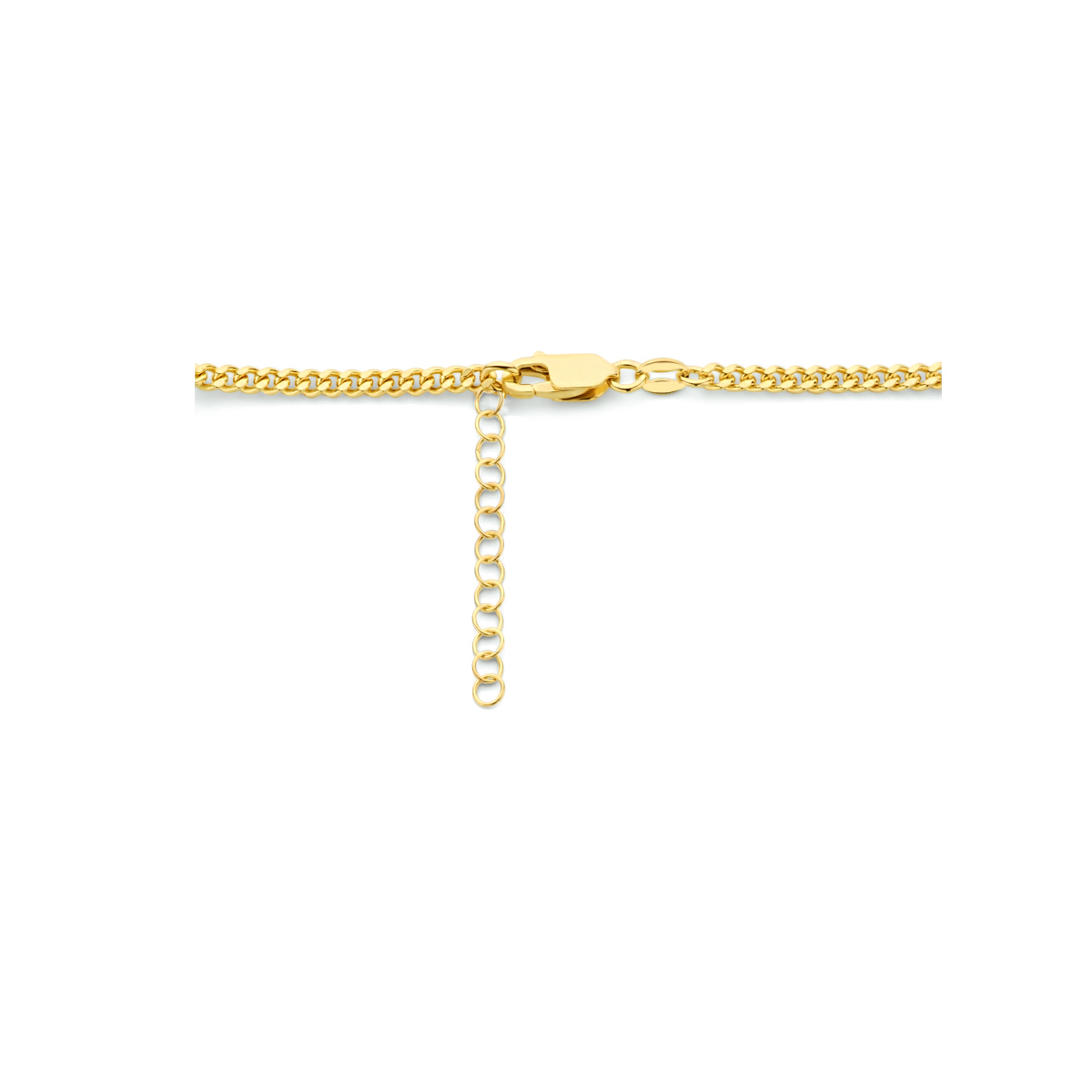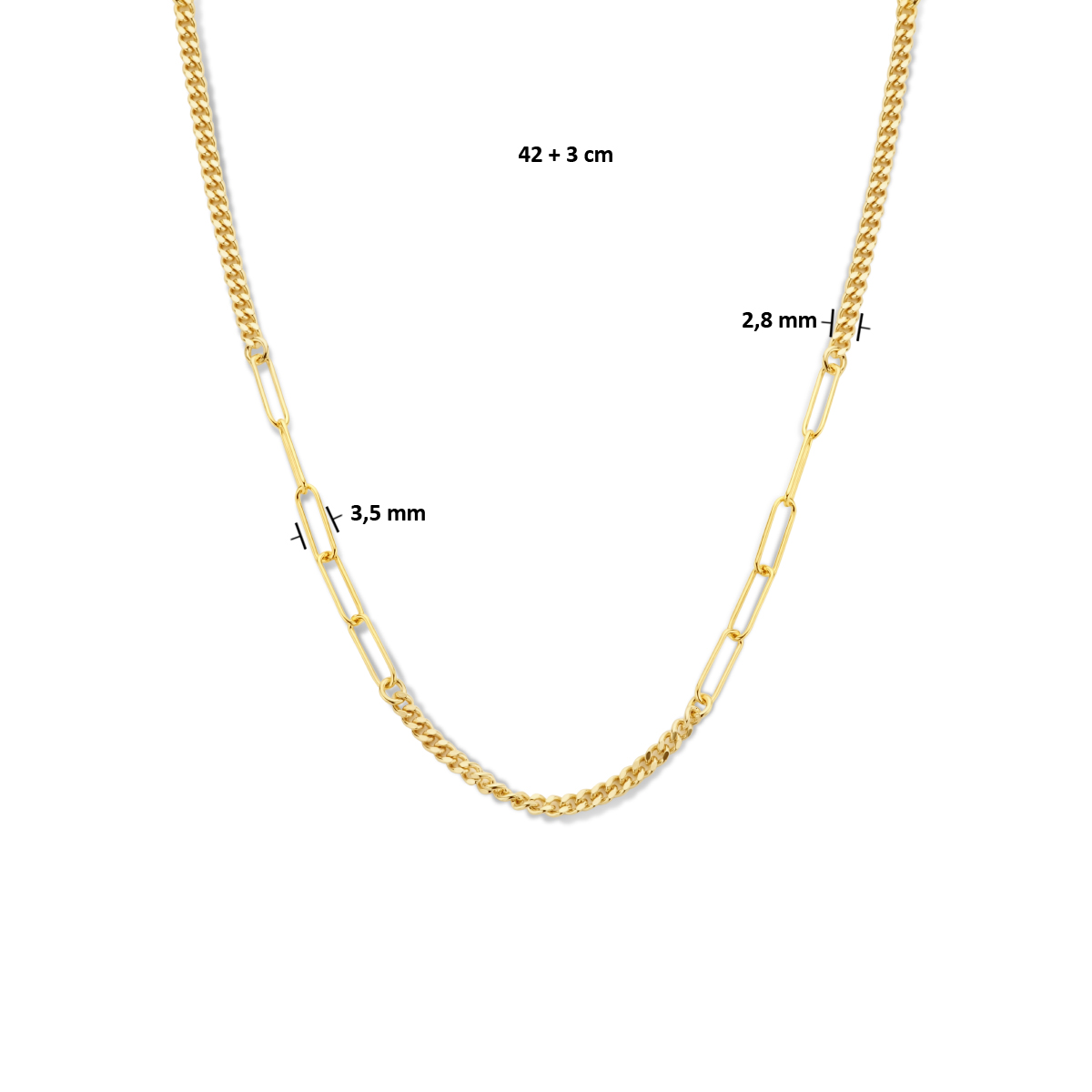 Geelgoud op 925 zilveren collier uitgevoerd met een gourmette schakel van 2,8mm en een paperclip schakel van 3.5mm. Het collier heeft een draaglengte van 42cm met een extensie van 3cm en een karabijn sluiting. Geen garantie op plating.