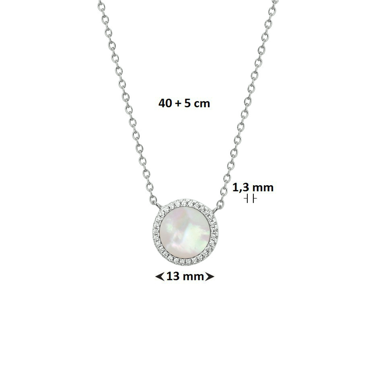 Zilveren collier met een parelmoer rondje en zirkonia. De lengte bedraagt 40cm met 5cm extensie en de schakelbreedte bedraagt 1.3mm.