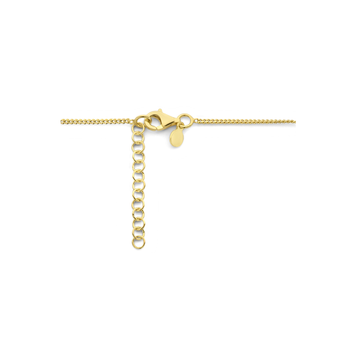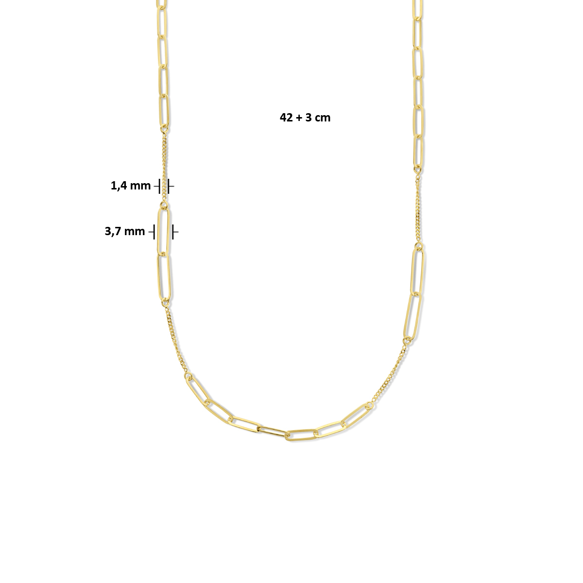 Geelgoud op 925 zilveren collier met een paperclip schakel van 3.7mm en een gourmette schakel van 1.4mm. Het collier heeft een draaglengte van 42cm met een extensie van 3cm. Uitgevoerd met een karabijn sluiting. Geen garantie op plating.