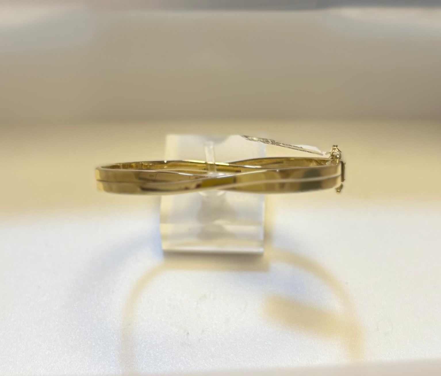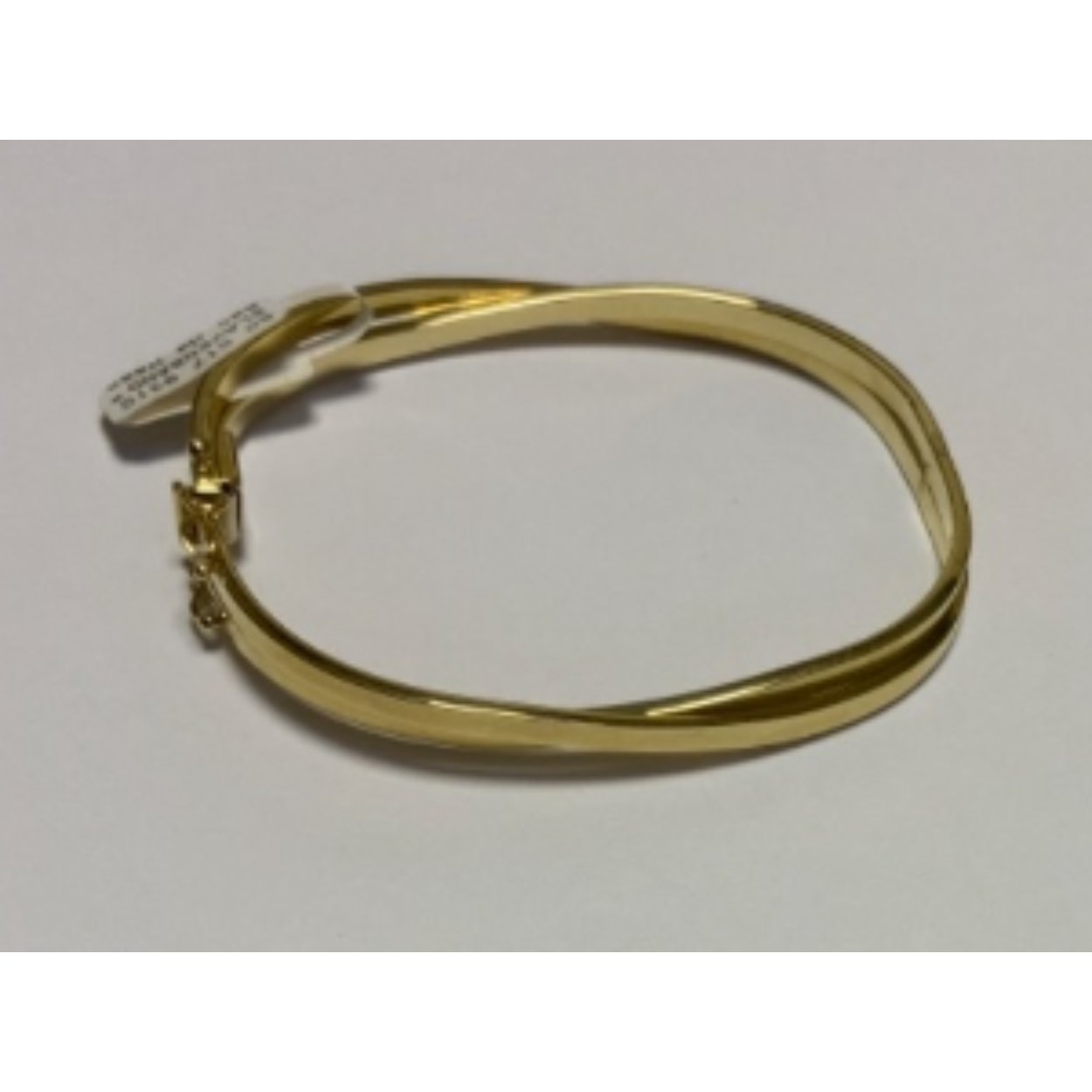 Goud bangle armband met scharnier en 2x vh8. 2 banen welke elkaar kruisen aan de bovenkant. Doorsnede; 61 mm, van 3 tot 6 mm breed.