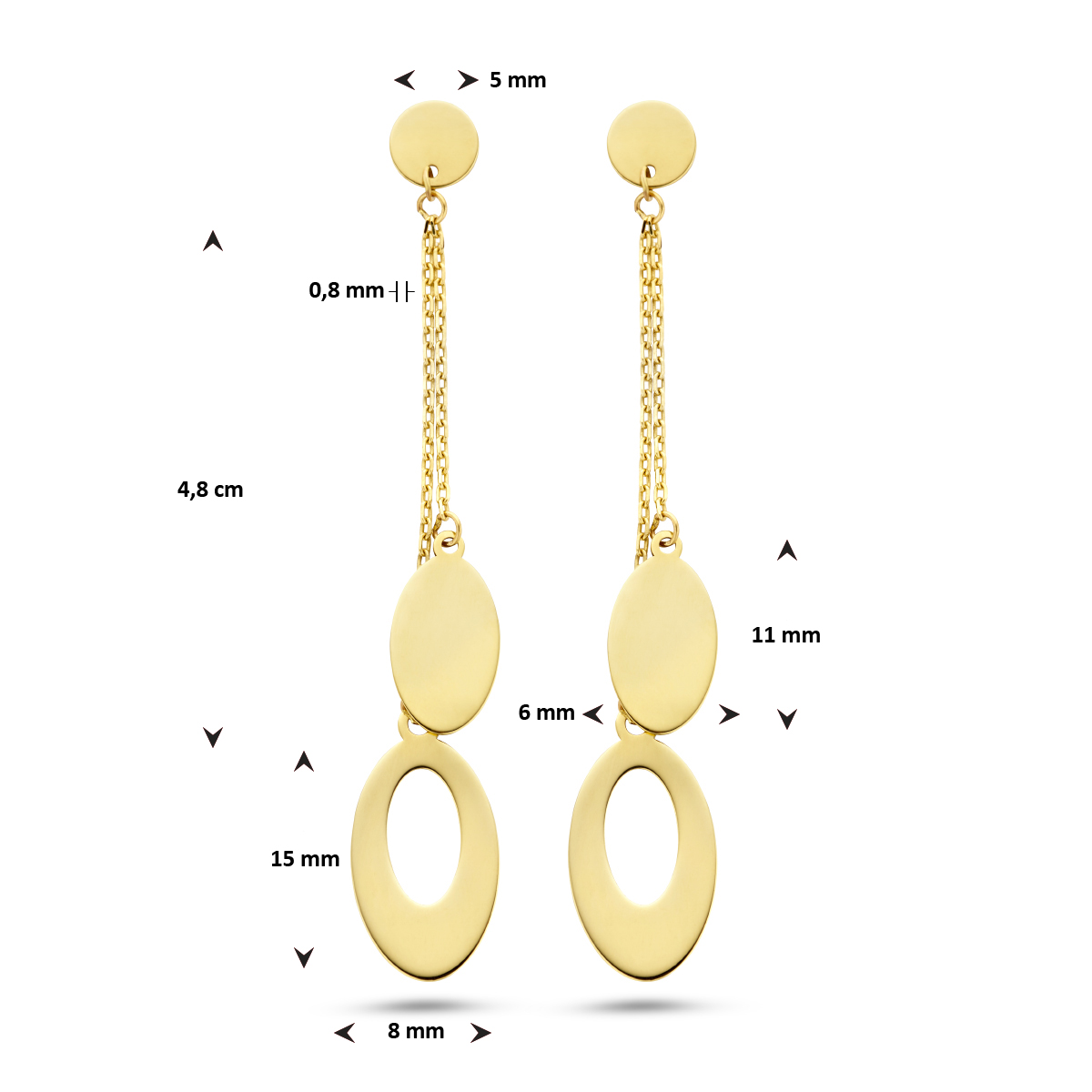 14k Geelgouden oorhangers uitgevoerd met ovaalvormige elementen. De oorhangers hebben een totale hoogte van 48mm.