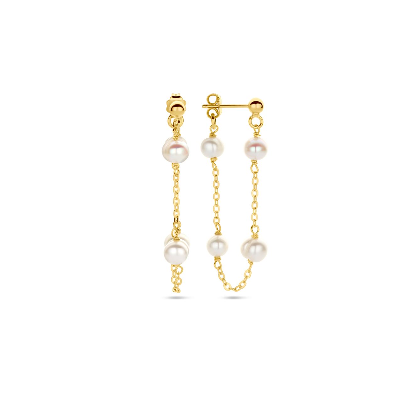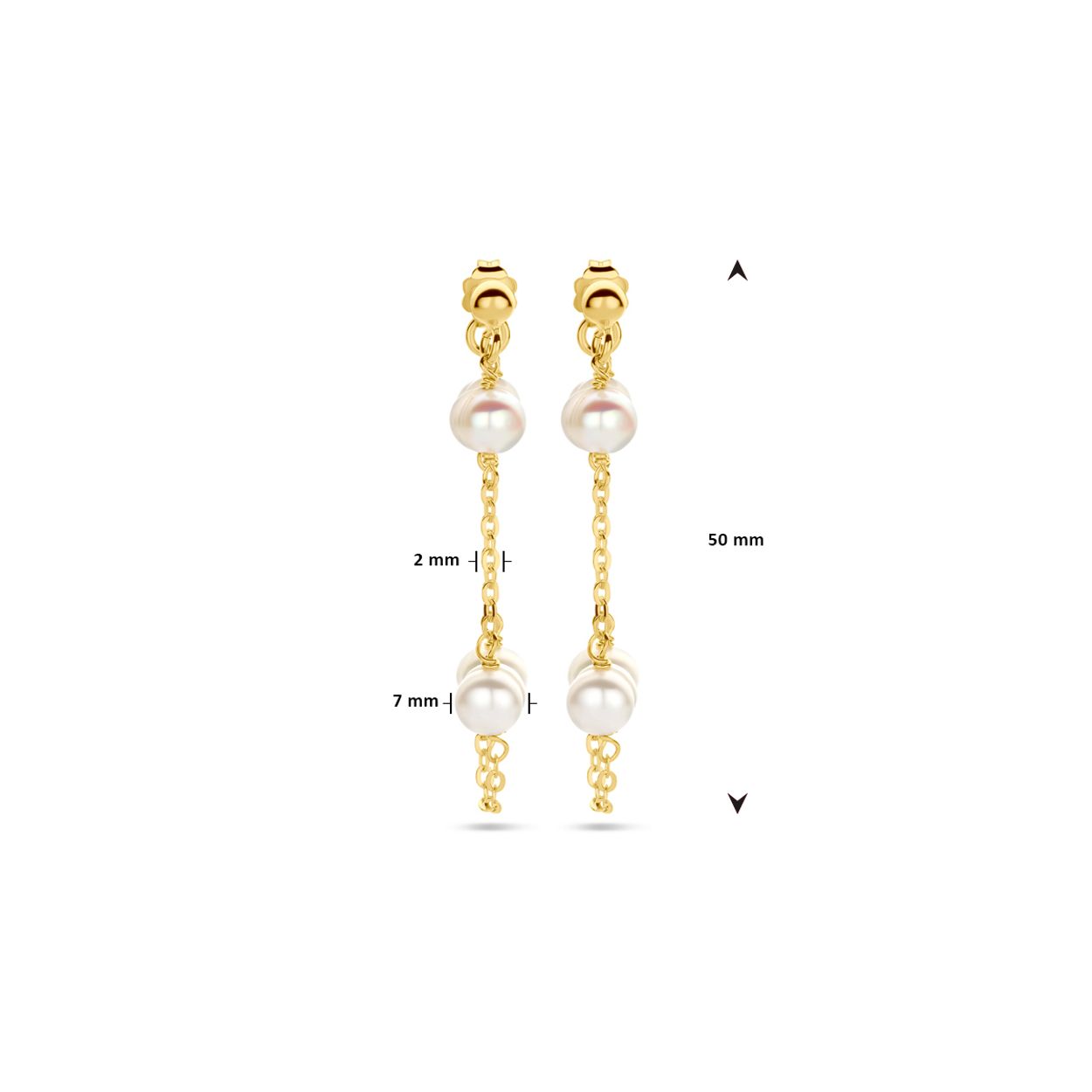 Geelgoud op 925 zilveren oorhangers uitgevoerd met zoetwaterparels. De oorhangers hebben een totale hoogte van 50mm. De breedte van de schakel is 2mm. Geen garantie op plating.