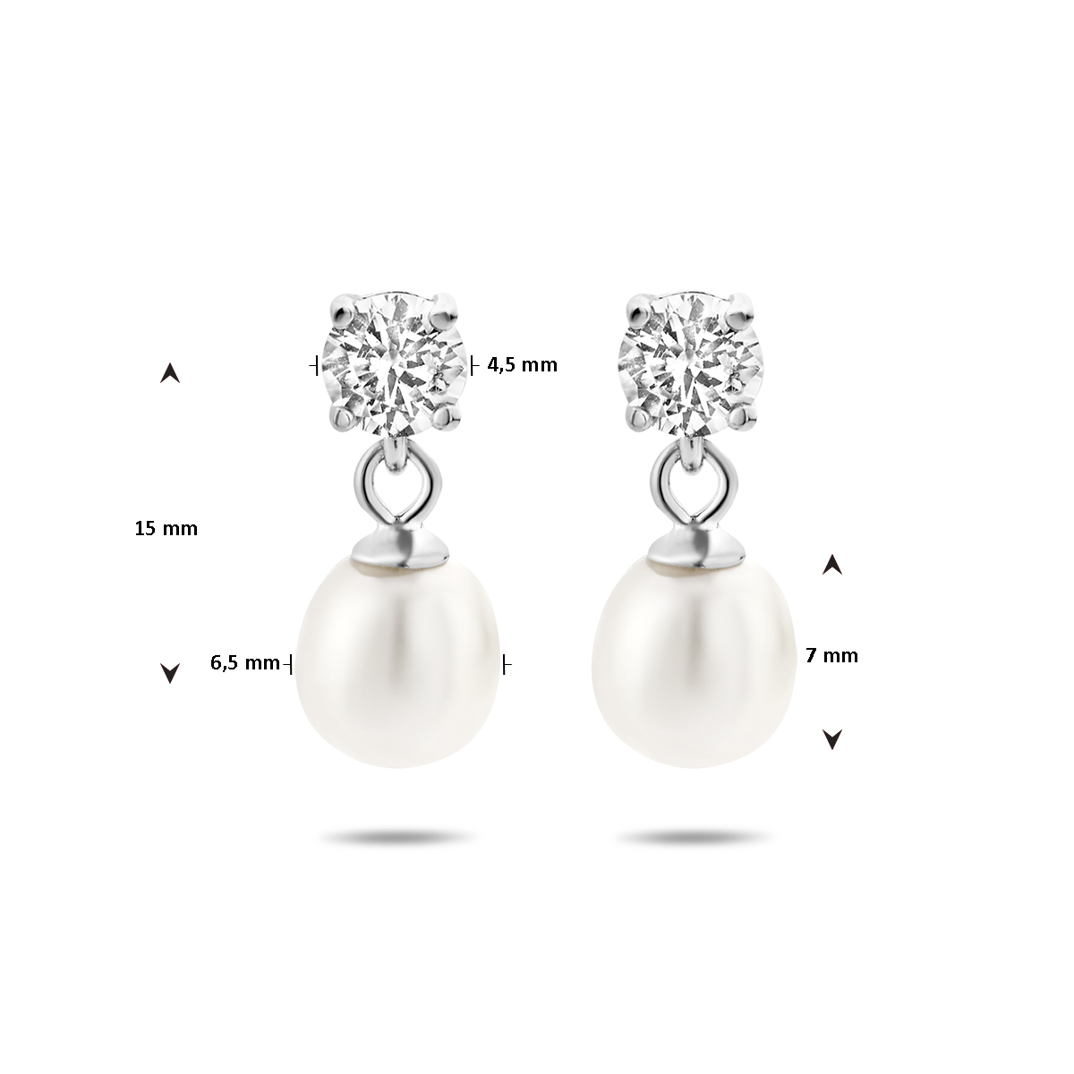 Gerhodineerd 925 zilveren oorhangers uitgevoerd met wit zirkonia en zoetwaterparel. De oorhangers hebben een totale hoogte van 15mm.