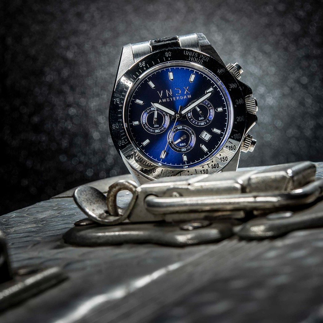 Stoer, mysterieus en sterk. Met deze Dark DJ Zilver Blauw heb je een stoer en modern massief stalen horloge om je pols. De kast en band zijn van staal, om de blauwe wijzerplaat met chronometers zit een stoere blauwe ring. Ben de DJ van je eigen leven, leef volgens je eigen regels. Never too late to start!