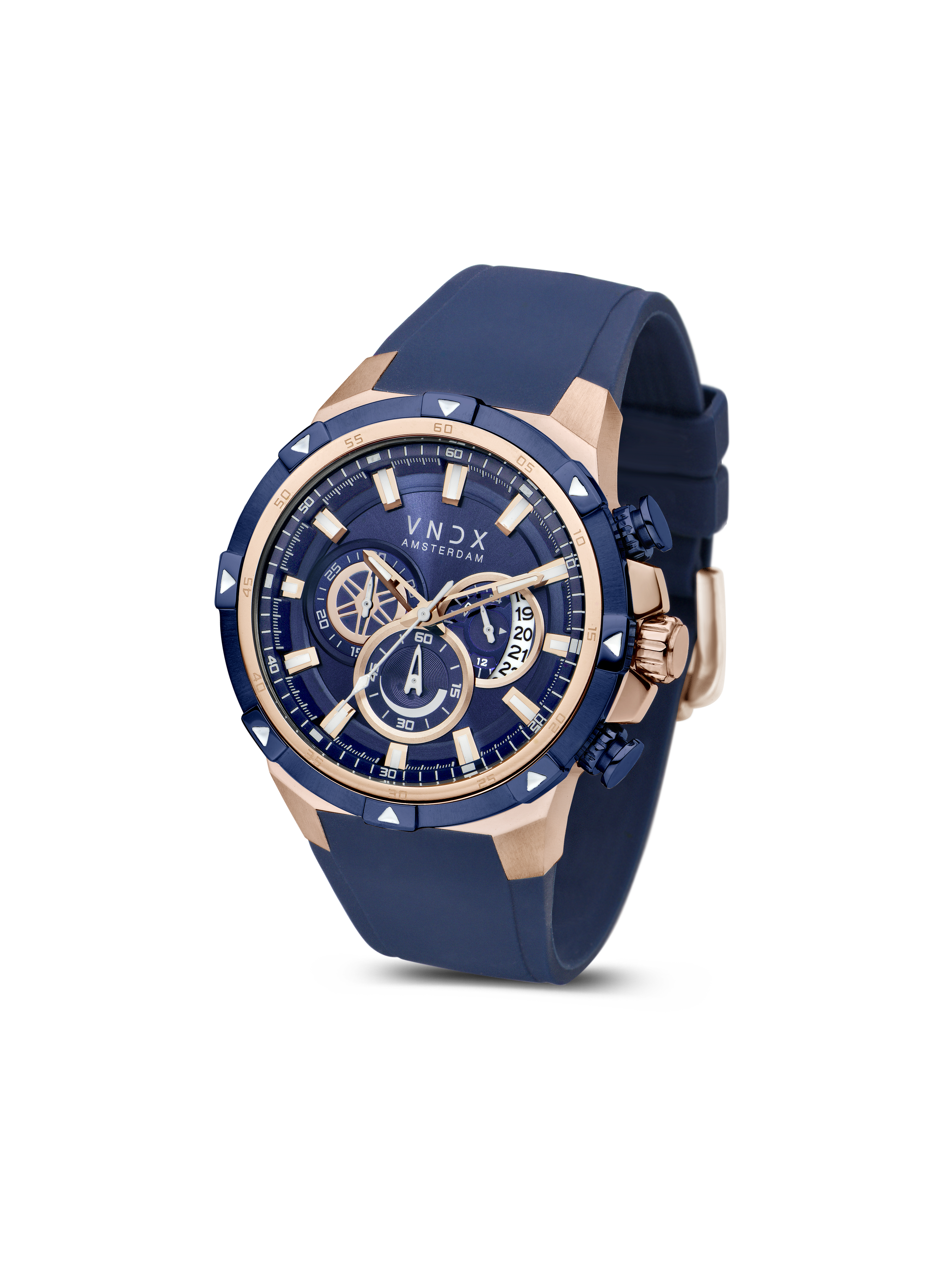 Deze chronograaf is voorzien van verschillende functies, zoals een stopwatch, datum aanduiding en een 24-uurs klok. De veelzijdige chronograaf wordt gepresenteerd op een intens blauwe wijzerplaat.