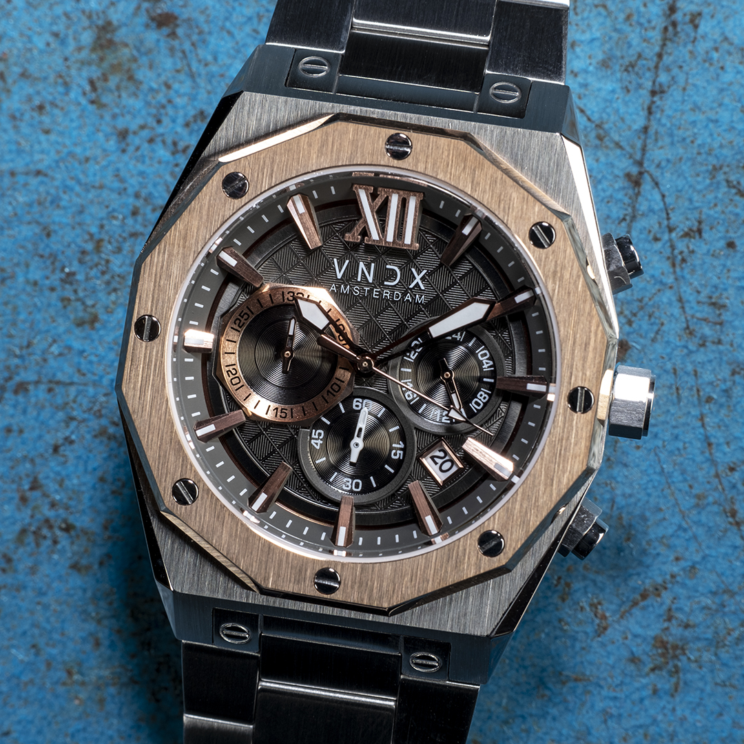 Dit horloge is hét model voor de stijlvolle man! De combinatie van het elegante zilver met de strakke zwarte wijzerplaat creëert een genot om te dragen. Het zilver en rosé zorgt voor een stijl die aansluit op iedere outfit. Dit horloge is als Wise Man te dragen tijdens zakelijke momenten, maar miststaat zeker niet bij Rebelse weekenden. Voorzien van een chronograaf kent deze Wise Man verschillende mogelijkheden. Bang om het horloge te verliezen hoef je niet te zijn. Het horloge beschikt over een vouwsluiting die gezekerd is. Zo zorgt VNDX ervoor dat jij en je Wise Man nooit te laat zijn. ''Be you, be wise and always do things you feel right about! The Wise Man''