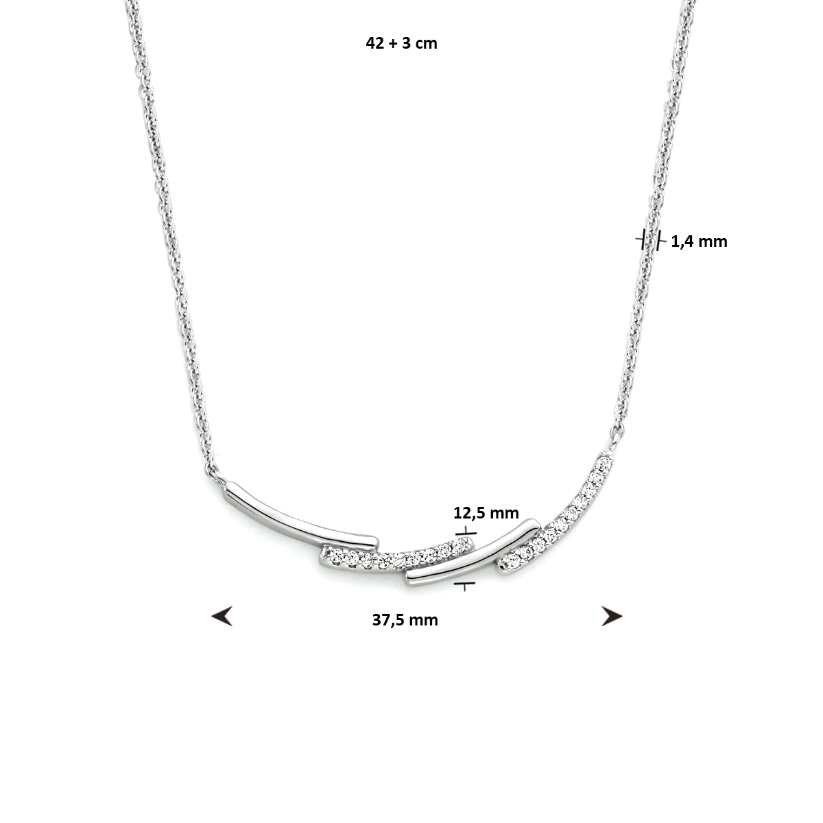 Gerhodineerd 925 zilveren collier uitgevoerd met een schitterende zirkonia rij. Het collier heeft een draaglengte van 42cm met een extensie van 3cm en een stevige karabijn sluiting.