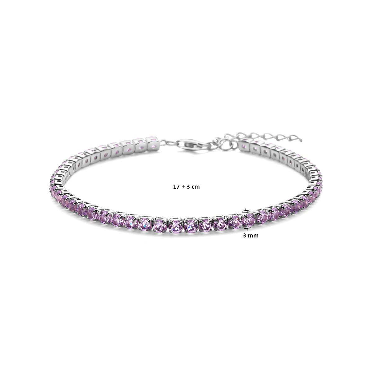 Gerhodineerd 925 zilveren tennisarmband uitgevoerd met paars zirkonia. De armband heeft een draaglengte van 17cm met 3cm extensie. Uitgevoerd met karabijn sluiting.