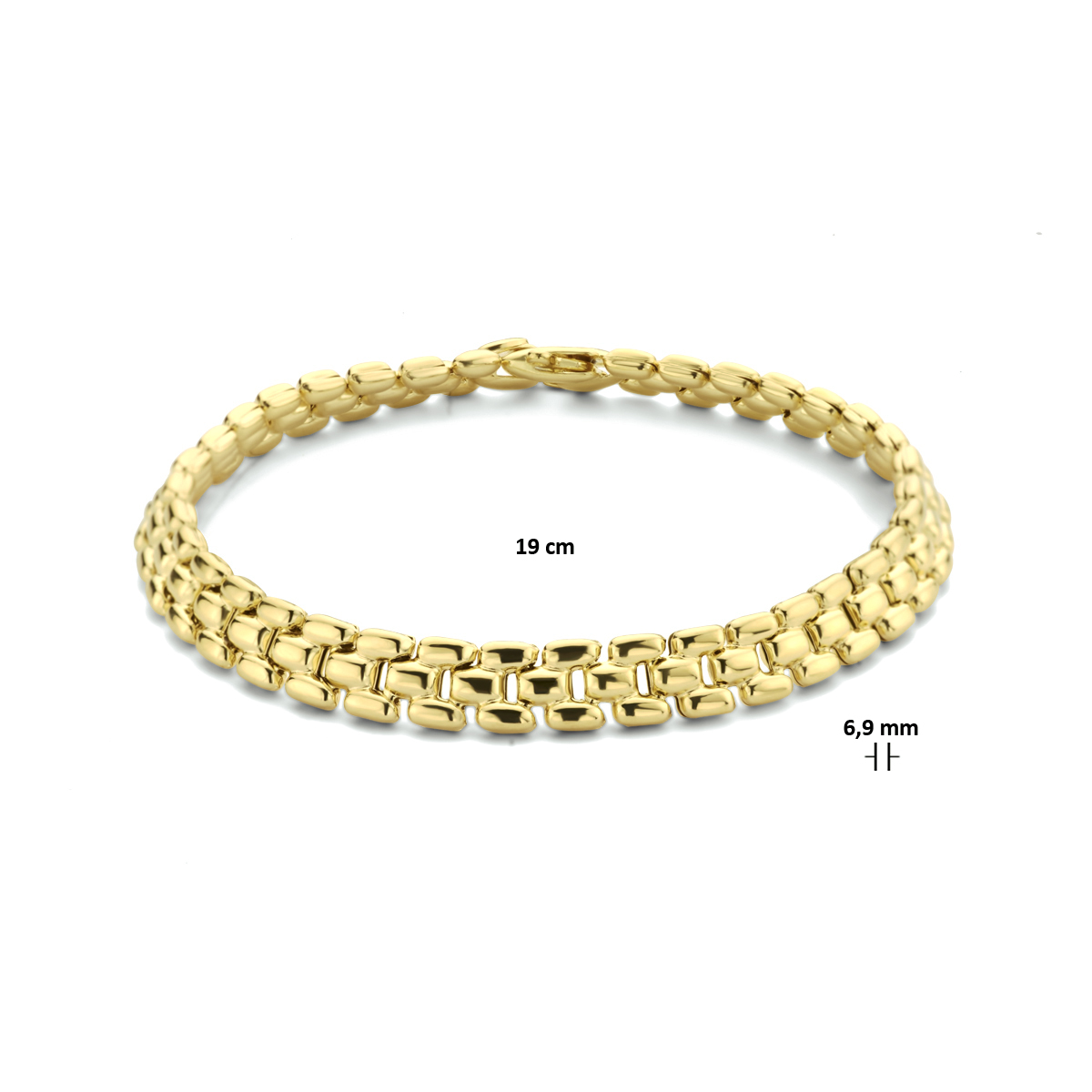 Geelgoud op 925 zilveren panter armband met een breedte van 6.9mm. De armband heeft een draaglengte van 19cm. Geen garantie op plating.