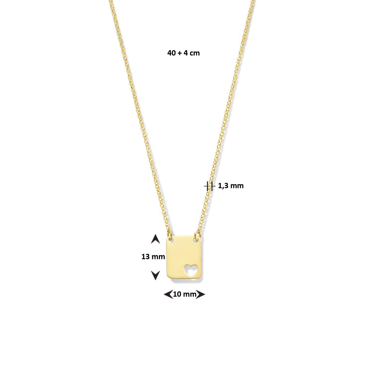 Verguld op 925 zilveren graveercollier uitgevoerd met een hartje, met een dikte van 0.4mm en een karabijn sluiting. Het collier heeft een draaglengte van 40cm en een extensie van 4cm. De schakelbreedte is 1.3mm. Geen garantie op plating.