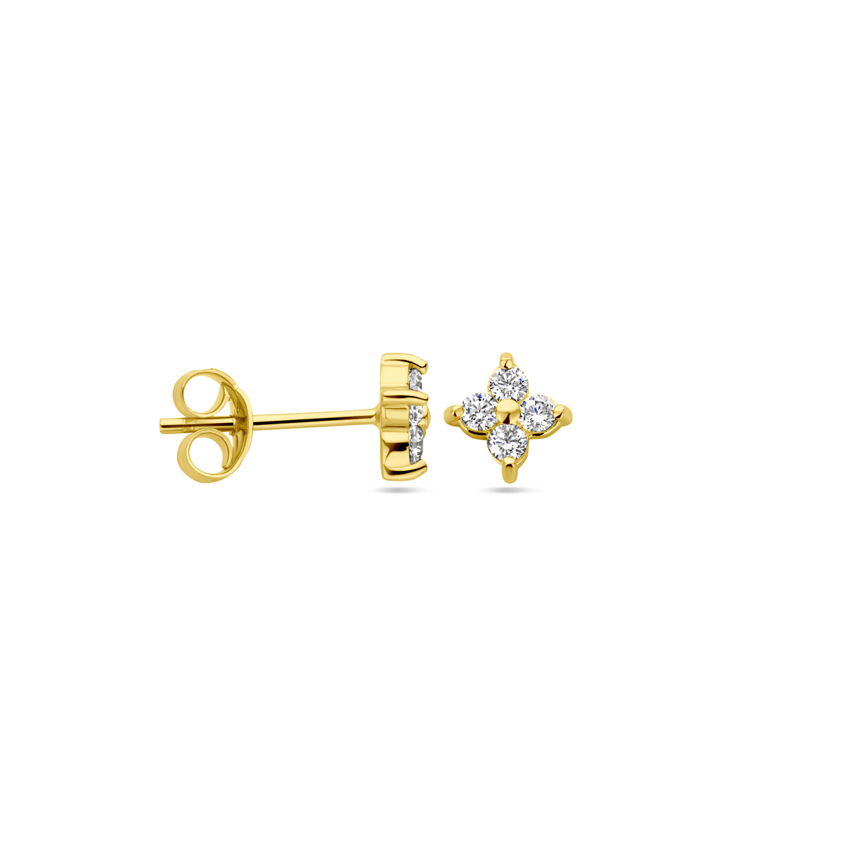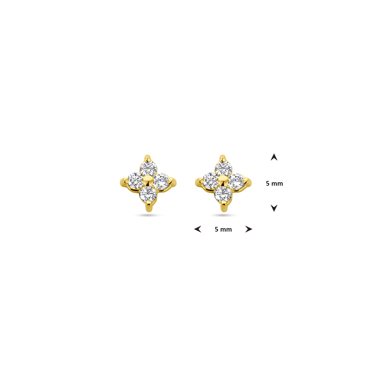 Verguld op 925 zilveren oorknoppen in de vorm van een bloem uitgevoerd met zirkonia. De oorknoppen hebben een afmeting van 5x5mm. Geen garantie op plating.