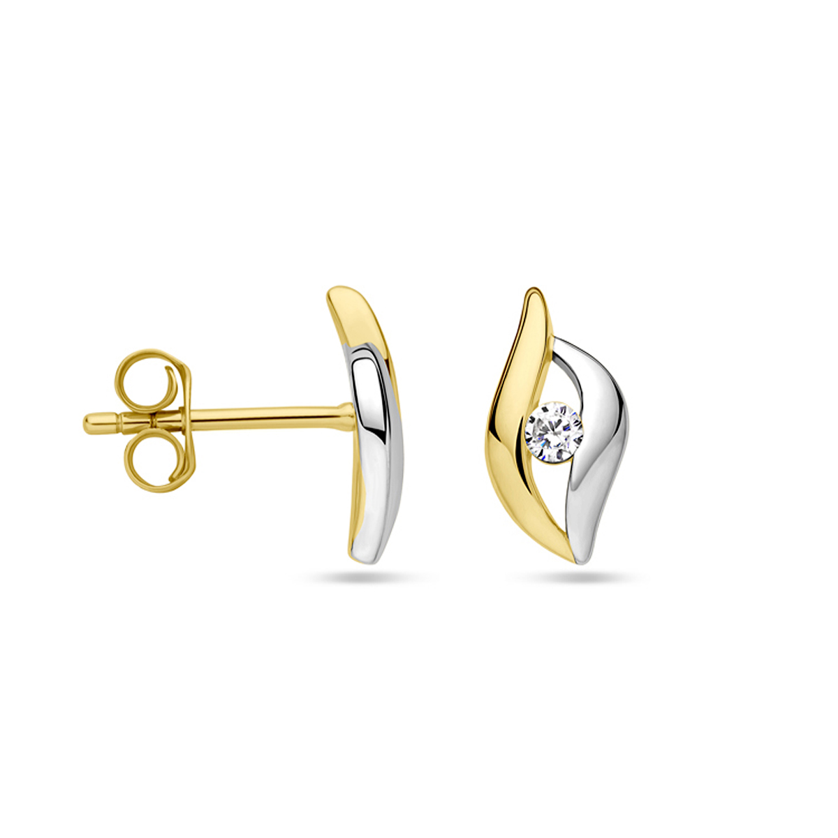 925 Zilveren oorstekers, deels gerhodineerd en deels met 1 micron geelgoud plating. De oorstekers zijn uitgevoerd met zirkonia. Geen garantie op plating.