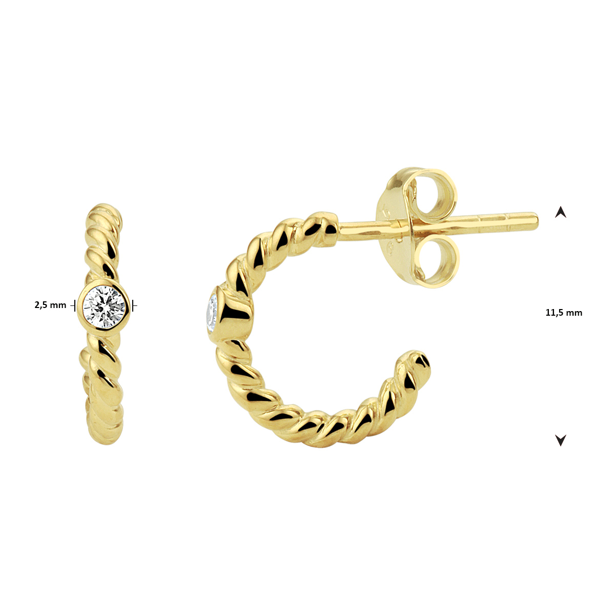 Verguld op 925 zilveren stekeroorringen uitgevoerd met een schitterende zirkonia. De oorstekers hebben een dikte van 2.5mm. Geen garantie op plating.